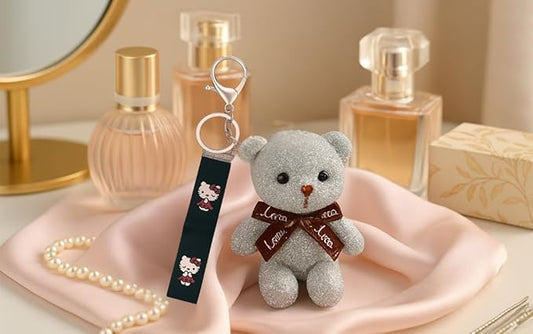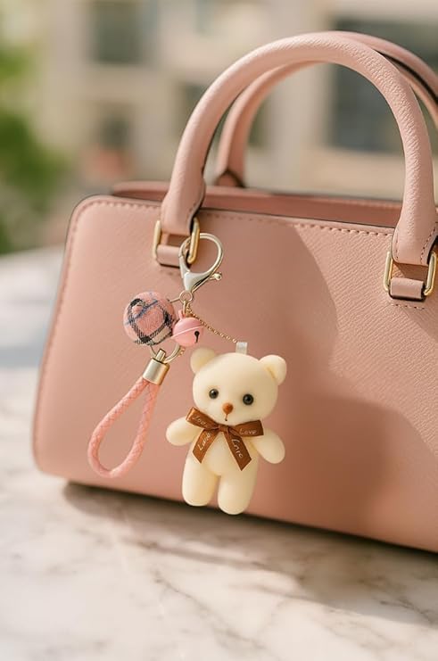 Cute Teddy Bear Keychain for Girls | Soft Plush Toy with Pink Bell & Braided Loop | Bag & Car Hanging Charm | Stylish Keyring for Gifting – Birthday, Friendship Day