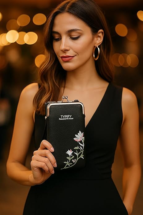 TYPIFY Women’s Sling Bag – Stylish PU Leather Crossbody Bag with Floral Embroidery | Adjustable Strap | Mobile Pouch for Casual, Travel, Shopping & Party Use | Gift for Her (Black)